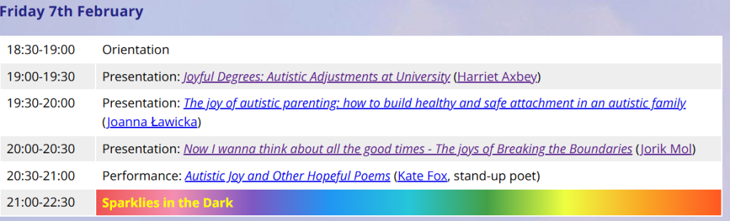 Please book for the entire event, it’s online and only £20 for all three days. I’m in between two incredible women and friends: Joanna Ławicka and Kate Fox. And, yes, I’ve called my talk after a pop girlie song. Thank you Daria. Please book here: Autscape: 2025 Schedule (7-9 Feb).